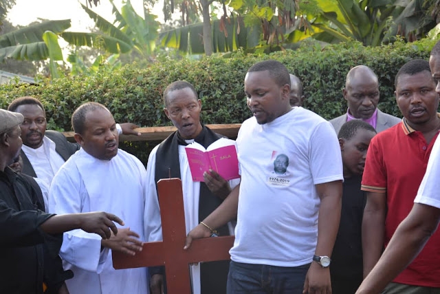 Baadhi ya Viongozi wa kanisa la Sent-James Anglican PASTOR, MICHAEL GILAISI  QAWOGA  UIJILISTI NA UMISSION.wakiongoza ibada nyumbani ya maziko ya aliyekuwa mwandishi wa Habari wa Idhaa ya Kiswahili DW