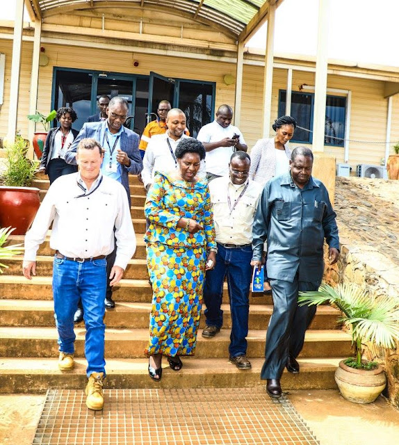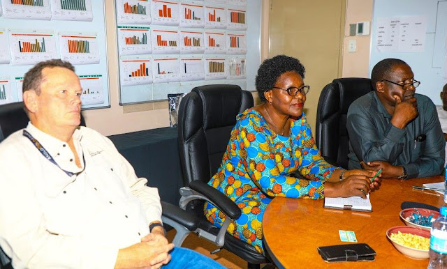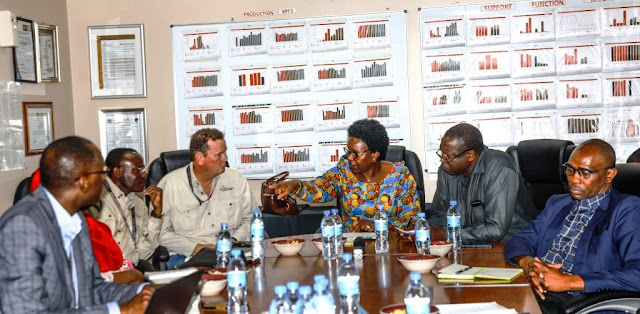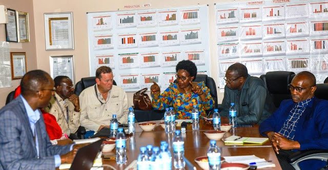 Naibu Waziri wa Ardhi Nyumba na Maendeleo ya Makazi Dkt Angeline Mabula akimsikiliza Mshauri wa Masuala ya Sheria wa Mgodi wa Dhahabu wa Geita Elizaberth Karua (hayupo pichani) wakati alipoutembelea mgodi huo kufuatilia ulipaji wa kodi ya pango la ardhi tarehe 10 Julai 2019. Kulia ni Mkuu wa wilaya ya Geita Josephat Maganga na kushoto ni Mkurugenzi Mtendaji wa Mgodi wa Dhahabu wa Geita (GGML) Richard Jordison.