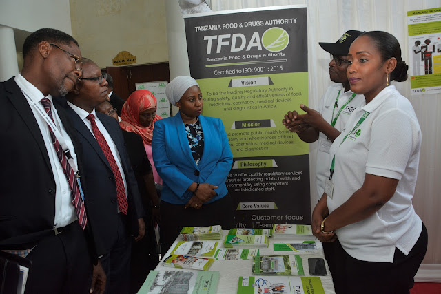 Waziri wa Afya, Maendeleo ya Jamii, Jinsia, Wazee na Watoto Mhe. Ummy Mwalimu (watatu kutoka kulia)akipata maelekezo katika banda la (TFDA) wakati alipita katika mabanda ya maonesho baada ya kumaliza Mkutano wa Kimataifa wa 7 wa masuala ya Sayansi na Afya uliowakutanisha mawaziri wa afya kutoka nchi za Afrika Mashariki, mkutano huo umefanyika katika Kituo cha mikutano cha Kimataifa cha J.K Nyerere Jijini Dar es salaam.