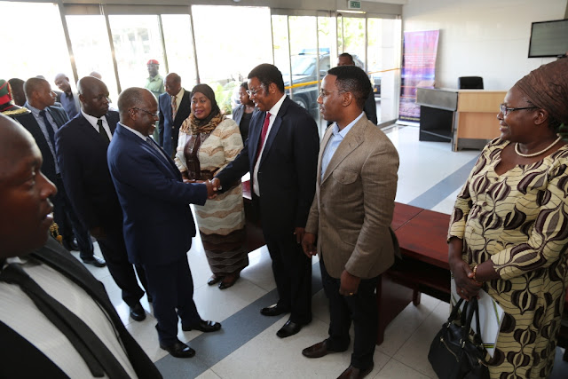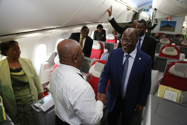 ais wa Jamhuri ya Muungano wa Tanzania Dkt. John Pombe Magufuli akisalimiana na Rais wa Mungano wa Visiwa vya Comoro Mhe. Azali Assoumani walipokutana kwenye ndege katika uwanja wa ndege wa kimataifa wa Julius Nyerere jijini Dar es salaam leo Jumamosi Januari 28, 2017 tayari kwa safari ya Addis Ababa, Ethiopia, kuhudhuria Mkutano wa Kilele wa 28 wa Wakuu wa nchi za Umoja wa Afrika (AU). Rais Assoumani alikuwa akitokea Comoro kupitia Dar es salaam