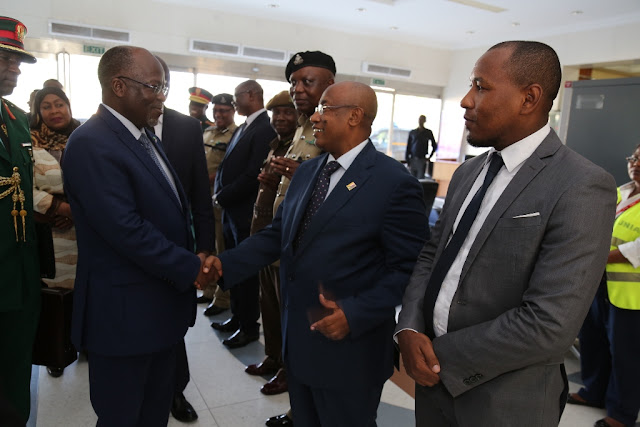 Rais wa Jamhuri ya Muungano wa Tanzania Dkt. John Pombe Magufuli akisalimiana na Balozi wa Comoro nchini Dk.Ahamada El Badaoui Mohamed katika uwanja wa ndege wa kimataifa wa Julius Nyerere jijini Dar es salaam leo Jumamosi Januari 28, 2017 wakati akielekea kupanda ndege kuelekea Addis Ababa, Ethiopia, kuhudhuria Mkutano wa Kilele wa 28 wa Wakuu wa nchi za Umoja wa Afrika (AU).