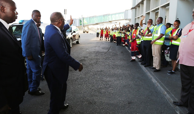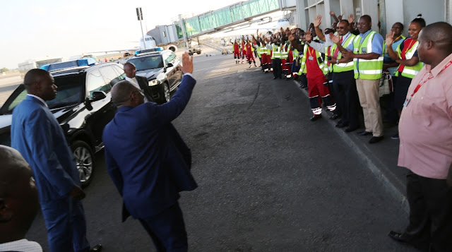 Rais wa Jamhuri ya Muungano wa Tanzania Dkt. John Pombe Magufuli akiwapungia mkono wafanyakazi katika uwanja wa ndege wa kimataifa wa Julius Nyerere jijini Dar es salaam leo Jumamosi Januari 28, 2017 wakati akielekea kupanda ndege kuelekea Addis Ababa, Ethiopia, kuhudhuria Mkutano wa Kilele wa 28 wa Wakuu wa nchi za Umoja wa Afrika (AU).