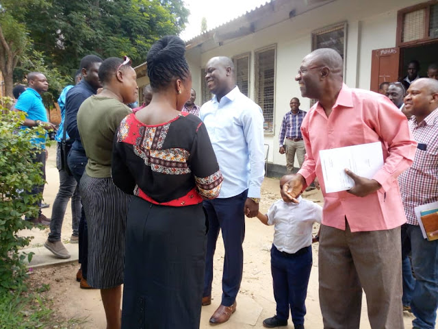 Naibu Waziri wa Maji Jumaa Aweso akisalimiana na walimu waliomfundisha wakati anasoma shule ya Sekondari Pugu, leo ametembelea shule hiyo na kuwahakikishia wanafunzi wa hapo watapata maji safi na salama.