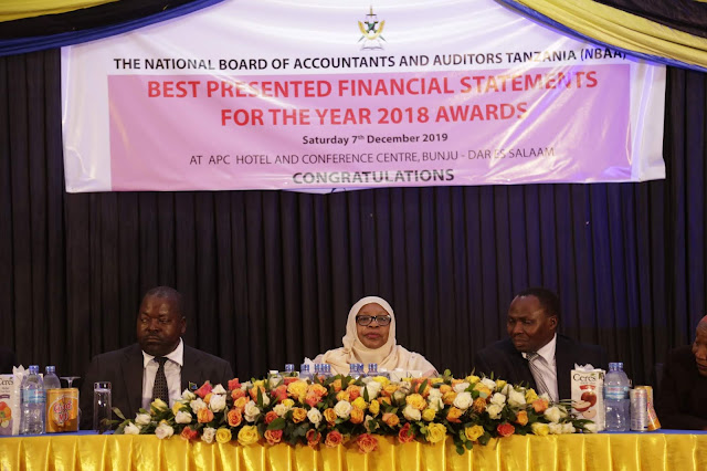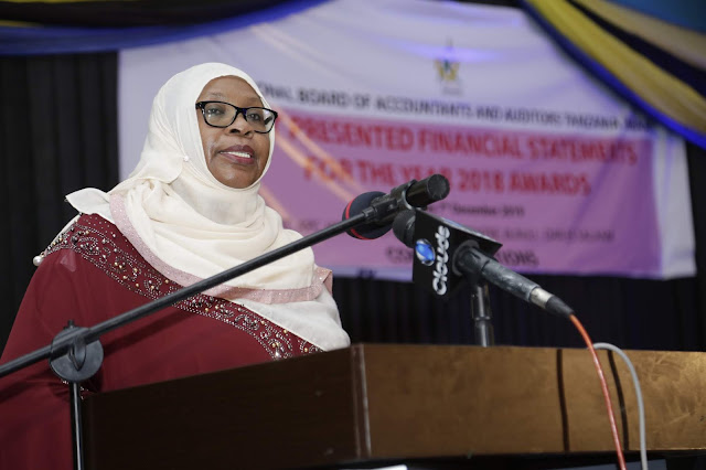 Naibu Katibu Mkuu, Wizara ya Fedha na Mipango, Bi. Amina Khamis Shaaban (kushoto), akimkabidhi tuzo ya mshindi wa kwanza ya umahiri katika uandaaji wa Taarifa za Fedha ya Mwaka 2018 (Best Presented Financial Statements for the Year 2018 Awards) inayotolewa na Bodi ya Taifa ya Wahasibu na Wakaguzi wa Hesabu (NBAA), Afisa Mkuu wa Fedha (CFO) wa Shirika la Umeme Nchini TANESCO, Bi.Renatha Ndege katika hafla ya kutoa tuzo kwa taasisi za umma na binafsi iliyofanyika jijini Dar es Salaam, Desemba 7, 2019.