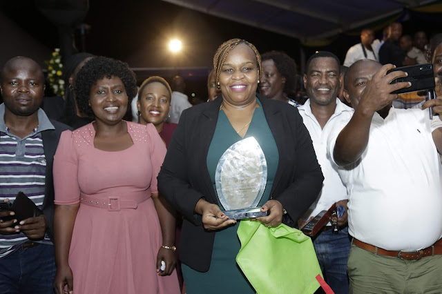 Bi.Renatha Ndege, akiwa amebeba tuzo hiyo, huku akisindikizwa na watumishi katika idara yake wakati wa hafla hiyo.