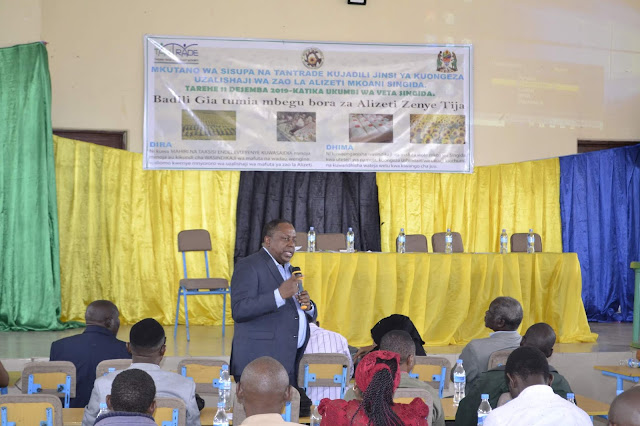 Mkurugenzi Mkuu wa Mamlaka ya Maendeleo ya Biashara nchini (TANTRADE) Edwin Rutageruka, akitoa taarifa fupi ya mambo yaliyojadiliwa kupitia mkutano wa Chama cha Wasindikaji wa Alizeti Singida (SISUPA) na Tantrade mkoani hapa jana, kabla ya kumkaribisha Mkuu wa Mkoa wa Singida, Dkt. Rehema Nchimbi kuzungumza, alisema kuna haja ya kuongeza tija na uzalishaji wa zao la alizeti kutokana na ukweli kwamba zao hilo kama malighafi bado halitoshelezi