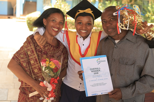 Mshindi wa Jumla wa tuzo za kimataifa za DStv Eutelsat Star Awards Pricilla Marealle akifurahi na wazazi wake Calvin Marealle na Jamila Marealle mara baada ya kukabidhiwa cheti cha ushindi. Pricilla aliibuka mshindi wa kwanza katika tuzo hizo na kuwashinda wanafunzi kutoka nchi zaidi ya 10 kote barani Afrika. Mbali na kutunukiwa cheti maalum, Pricilla atapata fursa ya kutembelea kituo cha Anga cha Afrika Kusini na makao makuu ya MultiChoice jijini Johannesburg.