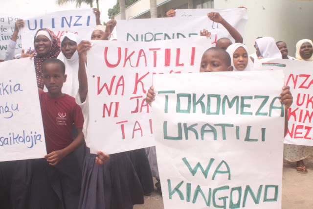 Wanafunzi na wazazi wakiwa wamebeba mabango yenye jumbe mbalimbali zinazopinga vitendo vya ukatili katika uzinduzi wa kampeni ya kupinga vitendo vya ukatili wa kingono leo kwa wanawake na watoto leo jijini Dar es Salaam.