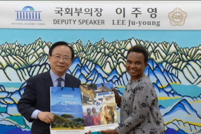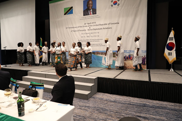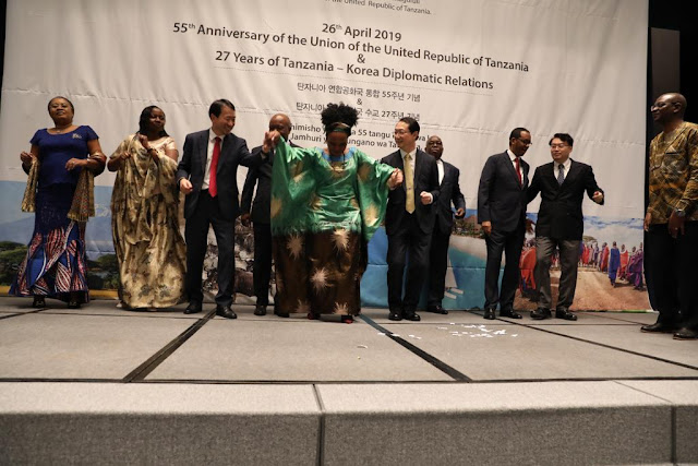 | Balozi wa Tanzania nchini Jamhuri ya Korea , Mhe. Matilda Masuka akitoa hotuba wakati wa maadhimisho ya kilele cha Wiki ya Tanzania katika kusherehekea miaka 55 ya Muungano wa Tanganyika na Zanzibar na miaka 27 ya uhusiano wa kidiplomasia kati ya Tanzania na Jamhuri ya Korea. Ubalozi wa Tanzania mjini Seoul uliandaa shughuli mbalimbali za kuitangaza nchi kama vile maonesho ya Tingatinga, maonesho ya Kahawa, semina za biashara, utalii na uwekezaji na kubadilishana utamaduni kupitia mapishi ya vyakula mbalimbali. Pia msaanii maarufu wa Tanzania Abdul Nasib maarufu kwa jina la Diamond alifanya onesho la muziki. Katika hotuba yake Balozi Masuka aliwapongeza watanzania na viongozi wa Tanzania kwa kuulinda Muungano na pia alisifu ushirikiano uliopo kati ya Tanzania na Jamhuri ya Korea. |