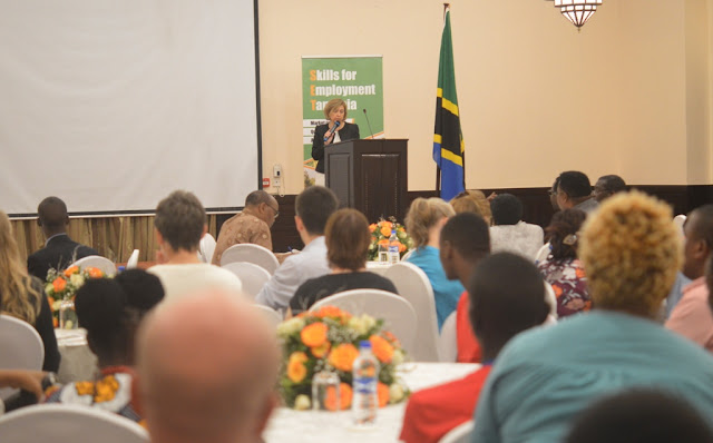 Balozi waUswisi nchini Florence Tinguely Mattli akizungumza kuhusu programu ya kuwasaidia vijana nchini katika kuboresha maisha yao kupitia programu za kuimarisha ujuzi huku shirika la maendeleo na ushirikiano la Uswisi (SDC) likitoa shilingi bilioni 55 kwa kipindi cha miaka 12 katika kuboresha maendeleo ya mafunzo ya ufundi stadi nchini Tanzania iliyofanyofanyika leo Jijini Dar es Salaam.