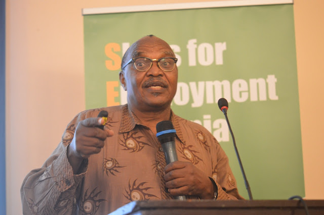 Profesa Samuel Wangwe akiwasilisha mada wakati wa uzinduzi wa programu ya kuwasaidia vijana nchini katika kuboresha maisha yao kupitia programu za kuimarisha ujuzi uliofanyika leo katika ukumbi wa hoteli ya Serena jijini Dar es salaam.