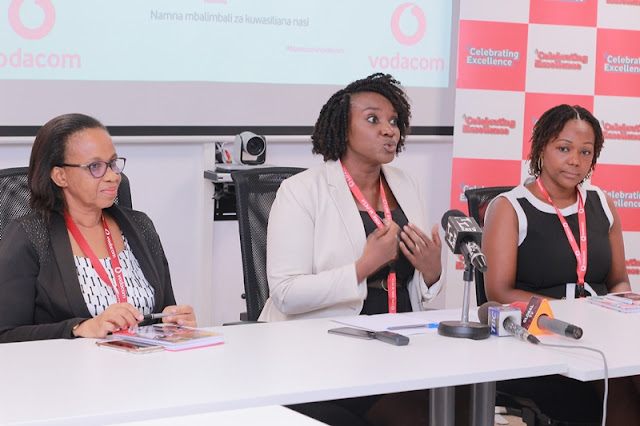 Mkurugenzi wa Huduma kwa Wateja wa Vodacom Tanzania, Bi. Harriet Lwakatare akizungumza na wanahabari wakati wa uzinduzi wa kampeni ya ‘NAWEZA NA VODACOM’ inayoelimisha wateja njia mbali mbali za kidijitali za kujihudumia na kutatua matatizo kwa haraka iliyofanyika leo makao makuu ya kampuni hiyo. Kulia ni Mkurugenzi wa Uhusiano na mawasiliano wa Vodacom Tanzania Bi. Rosalynn Mworia na Mkuu wa Idara ya ufanisi kwa Wateja, Bi. Najenjwa Mbagga.