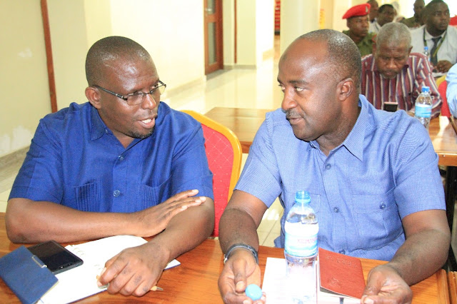 Mkuu wa Wilaya ya Mvomero Bw. Mohamed Utaly na Mkuu wa Wilaya ya Kilosa Bw. Adam Mgoyi, wakizungumza jambo wakati wa mkutano kati ya Naibu Waziri wa Fedha na Mipango Mhe. Dkt. Ashatu Kijaji (Mb) (hayupo pichani) na Wakuu wa Wilaya, Wakurugenzi na Watumishi wa TRA, Mkoani Morogoro