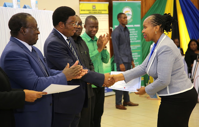 Waziri Mkuu, Kassim Majaliwa akimkabidhi , Afisa wa Mawasiliano wa NSSF, Lulu Mengele, Cheti cha Shukuruani kwa udhamini wa  NSSF  wa Mkutano wa Kazi wa Maafisa Habari na Mawasiliano  Serikalini alioufungua kwenye ukumbi wa Benki Kuu jijini Mwanza, Machi 18, 2019.  Kushoto ni Waziri wa Habari ,Utamaduni, Sanaa na Michezo, Dkt. Harrison Mwakyembe.
