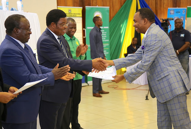 Waziri Mkuu, Kassim Majaliwa akimkabidhi cheti cha shukurani ya udhamini wa Mkutano wa Kazi wa Maafisa Habari na Mawasiliano Serikalini, Mkurugenzi Mtendaji wa Shirika la Reli Tanzania (TRL), Masanja Kadogosa baaada ya kufungua Mkutano wa siku tano wa Maafisa Habari na Mawasiliano Serikalini, Kwenye ukumbi wa Benki Kuu jijini Mwanza, Machi 18, 2019. Kushoto ni Waziri wa Habari, Umaduni, Sanaa na Michezo, Dkt.  Harrison Mwakyembe.