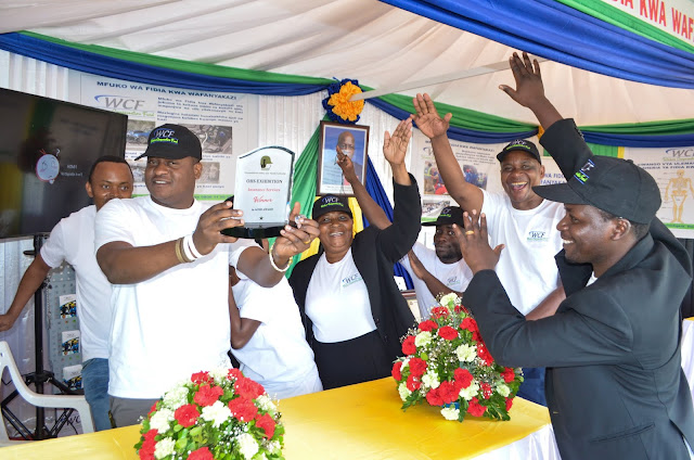Wafanyakazi wa Mfuko wa Fidia kwa Wafanyakazi (WCF) wakifurahia baada ya kupata wakifurahia pamoja na wafanyakazi wa Mfuko baada ya Mfuko kuwa Mshindi katika masuala ya afya na usalama kazini baina ya Taasisi za Bima na Mifuko ya Hifadhi ya Jamii