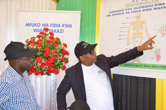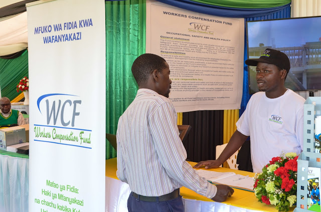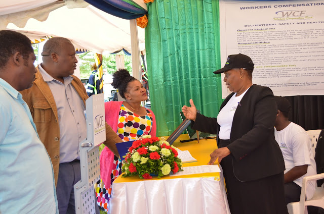 Afisa afya na usalama mahali pa kazi  kutoka Mfuko wa Fidia kwa Wafanyakazi Bw. Robert  Duguza akitoa maelezo juu ya huduma na mafao yatolewayo na WCF kwa mdau aliyetembelea banda la Mfuko huo