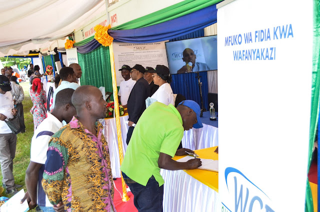 Afisa Matekelezo Mkuu wa Mfuko wa Fidia kwa Wafanyakazi (WCF), Bi. Amina Likungwala akitoa zawadi kwa wadau mbali mbali waliotembelea banda la WCF