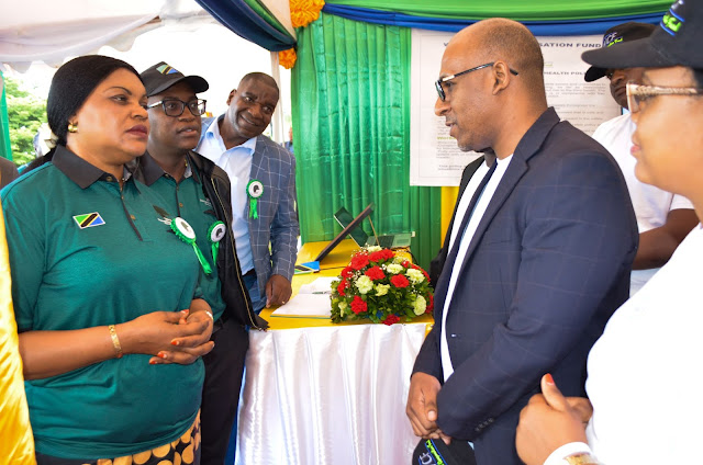 Waziri wa Nchi Ofisi ya Waziri Mkuu (Sera, Bunge, Kazi, Vijana, Ajira na Watu wenye Ulemavu) Mhe. Jenista Mhagama(wa kwanza kushoto) akipata maelezo ya Mfuko kutoka kwa Mkurugenzi wa Huduma za Tiba na Tathmini, Dkt. Abdulssalaam Omary (wa pili kulia) alipo tembelea banda hilo. Wa tatu kushoto ni Mwakilishi wa ILO Afrika  Bw. Jealous G. Chirove na Naibu  waziri  Nchi Ofisi ya Waziri Mkuu (Sera, Bunge, Kazi, Vijana, Ajira na Watu wenye Ulemavu) Mhe. Anthony Mavunde (katikati kulia)