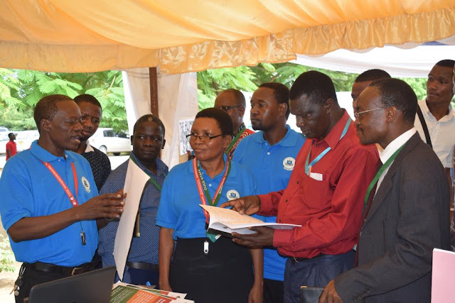 Naibu Mkuu wa Chuo Kikuu Kishirikishi cha Elimu Dar es Salaam DUCE Dr Julius Mbuna akitembelea mabanda ya maonesho ya wanataaluma waliofanya tafiti mbalimbali baada ya ufunguzi maadhimisho ya wiki ya utafiti ya Chuo Kikuu Dar es Salaam yanayofanyika kwa siku mbili April 3 hadi 4 kwenye Chuo cha DUCE, Wa pili Kulia ni Mkuu wa Kitengo cha Utafiti wa NECTA Dr Alfred Mdima.
